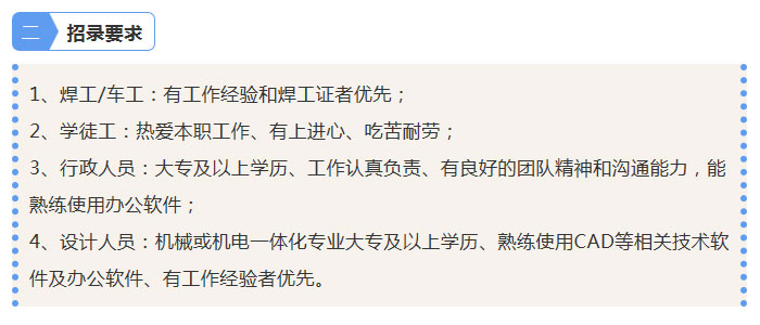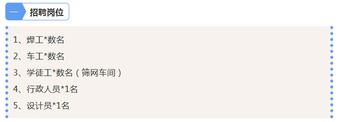 因公司擴(kuò)大生產(chǎn)、新建大型車間,新增不銹鋼篩網(wǎng)生產(chǎn)線,現(xiàn)面向社會招聘人才,具體如下: